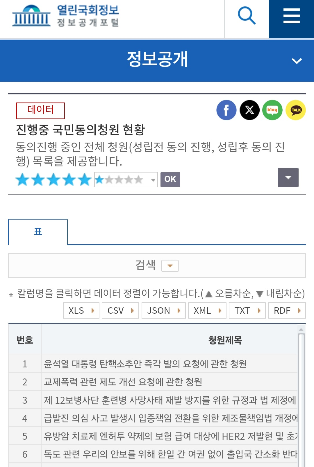 위 페이지에서 화면을 옆으로 슬라이드 하시면 제일 첫 줄에 있는 윤석열 대통령 탄핵소추안 즉각 발의 요청에 관한 청원 동의자 수가 나옵니다.